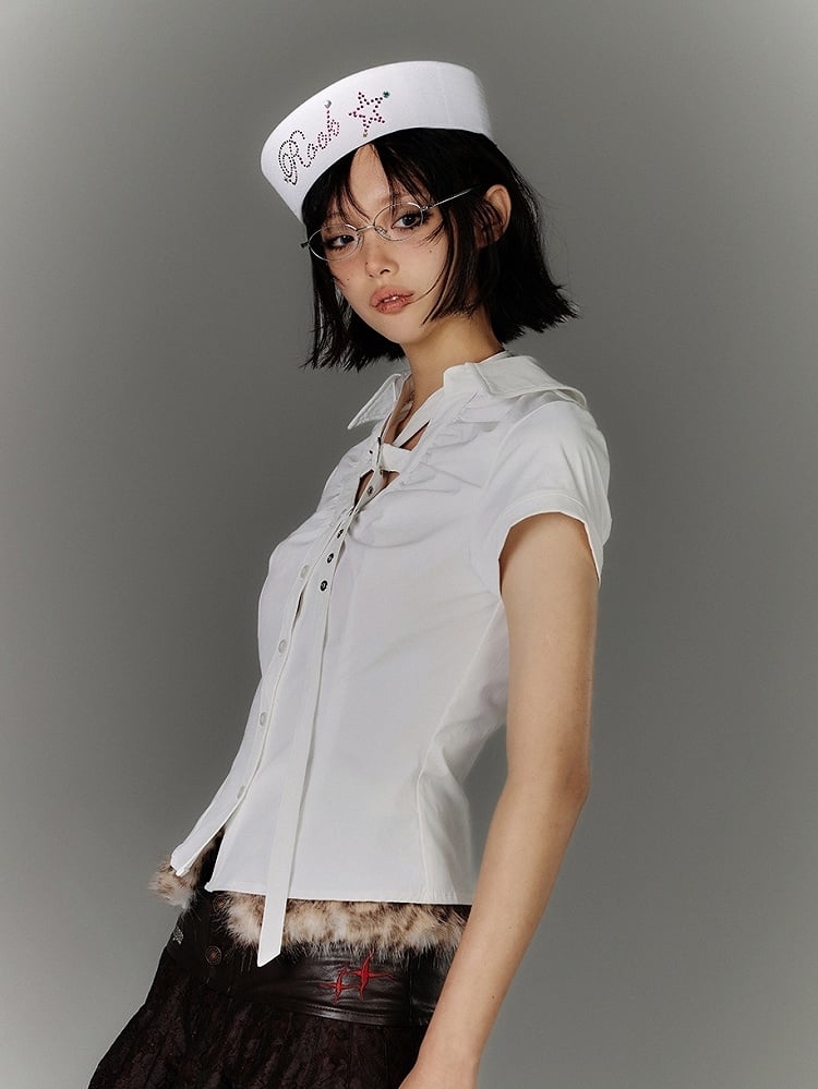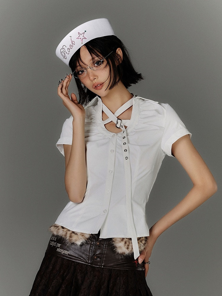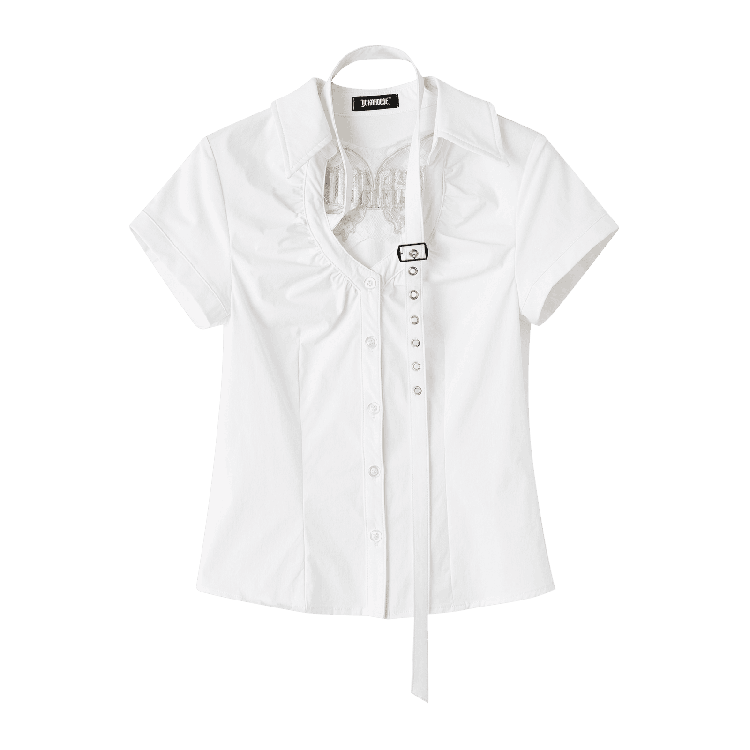 Embrace the perfect blend of elegance and edge with this stunning white shirt. Featuring a unique criss-cross design at the neckline, this top brings a modern twist to your wardrobe essentials. The delicate butterfly cutouts add a touch of whimsy and femininity, making it a versatile piece for both casual outings and dressier occasions. Crafted from high-quality fabric, this shirt ensures comfort and style with every wear.