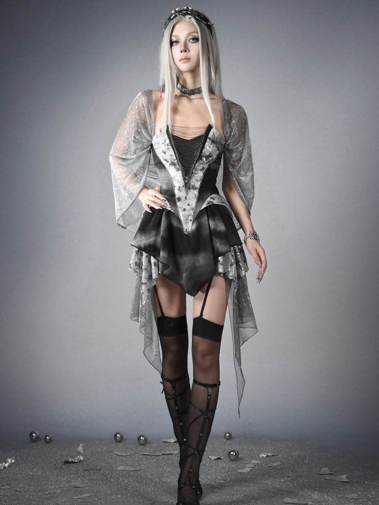 Step into the future with a touch of rebellion in this striking black dress. Featuring a unique Basque waist that accentuates your silhouette, this dress combines edgy punk aesthetics with modern elegance. The handkerchief hem adds a dynamic flow and movement, perfect for making a statement. Ideal for those who love to stand out, this dress is perfect for both casual outings and bold fashion events.