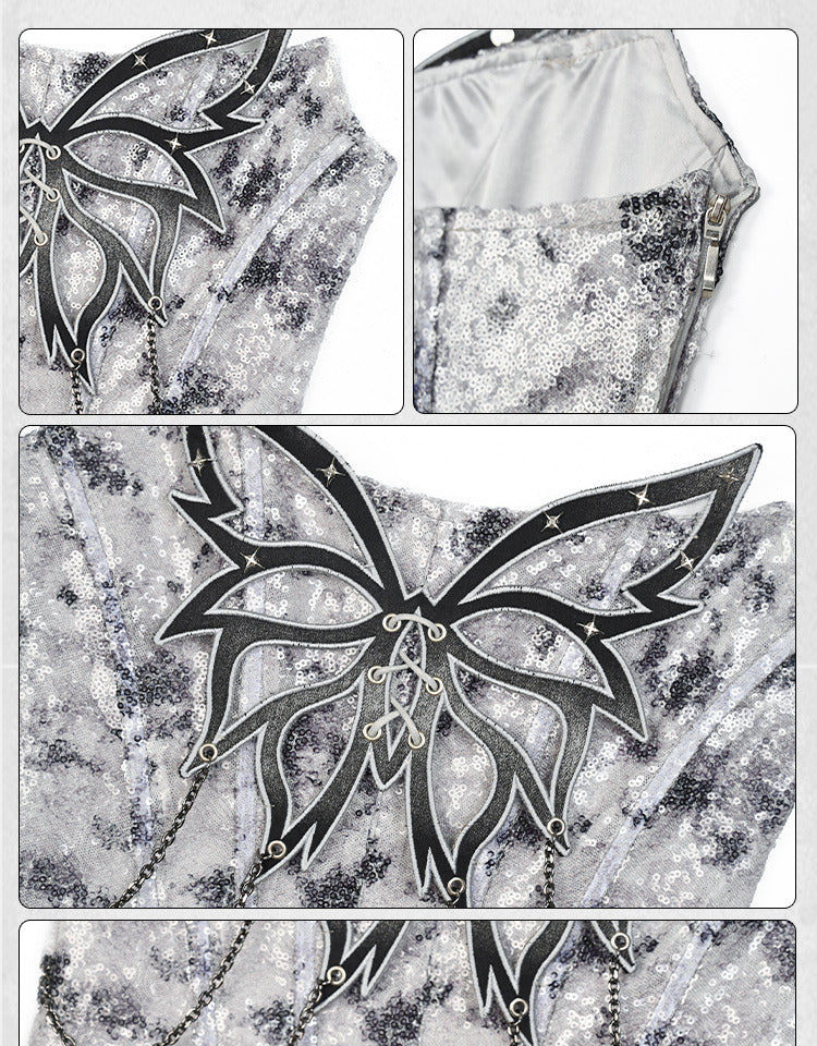 Embrace a blend of elegance and avant-garde fashion with this stunning strapless top. The futuristic silver-grey hue creates a sleek and modern aesthetic, while the butterfly chain detailing adds a touch of whimsical charm. The fishbone structure not only provides support but also enhances the silhouette, making it a perfect piece for those who love to stand out in style.