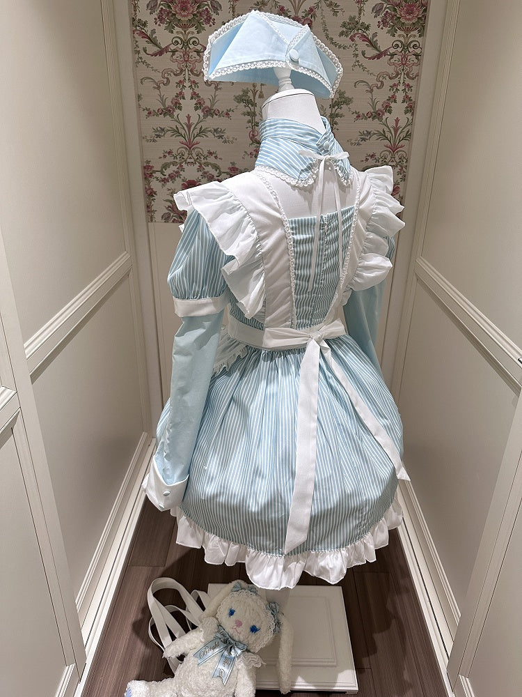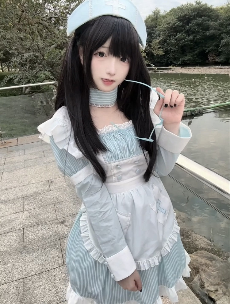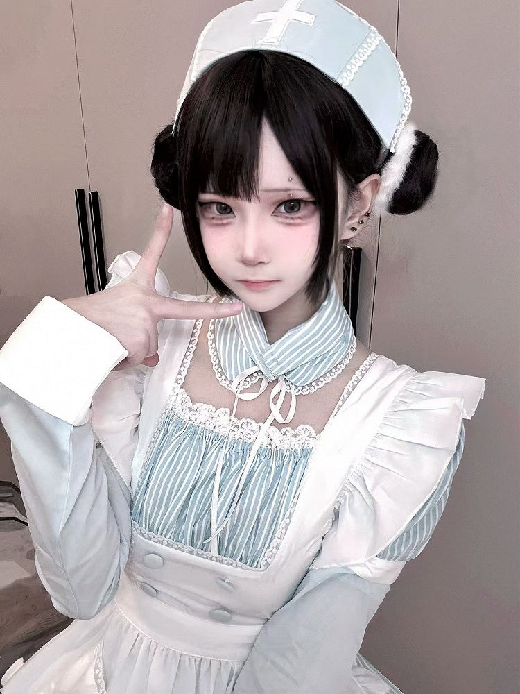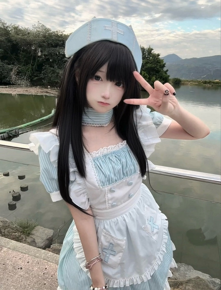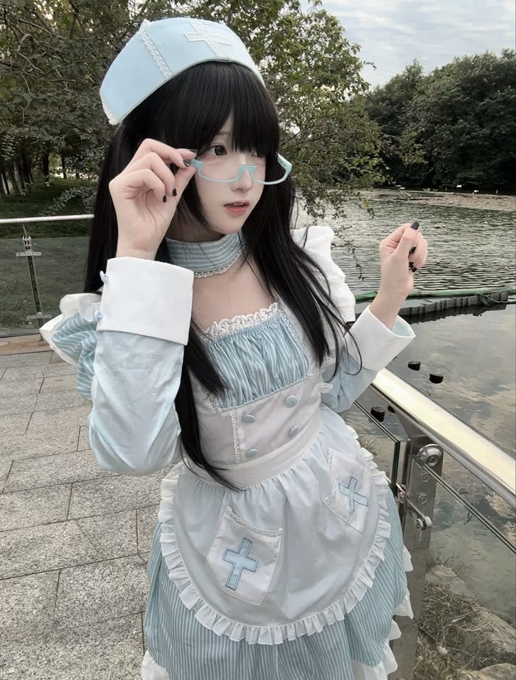 Embrace the enchanting world of Yami Kawaii fashion with this captivating light blue striped faux two-piece dress. The design cleverly mimics a layered look, combining the charm of a maid apron with the elegance of a classic dress. The intricate cross embroidery adds a touch of mystery and depth, perfectly aligning with the Yami Kawaii aesthetic. Accompanied by a matching nurse hat, this ensemble offers a unique blend of cute and dark elements, making it a standout piece for those who dare to express their individuality.