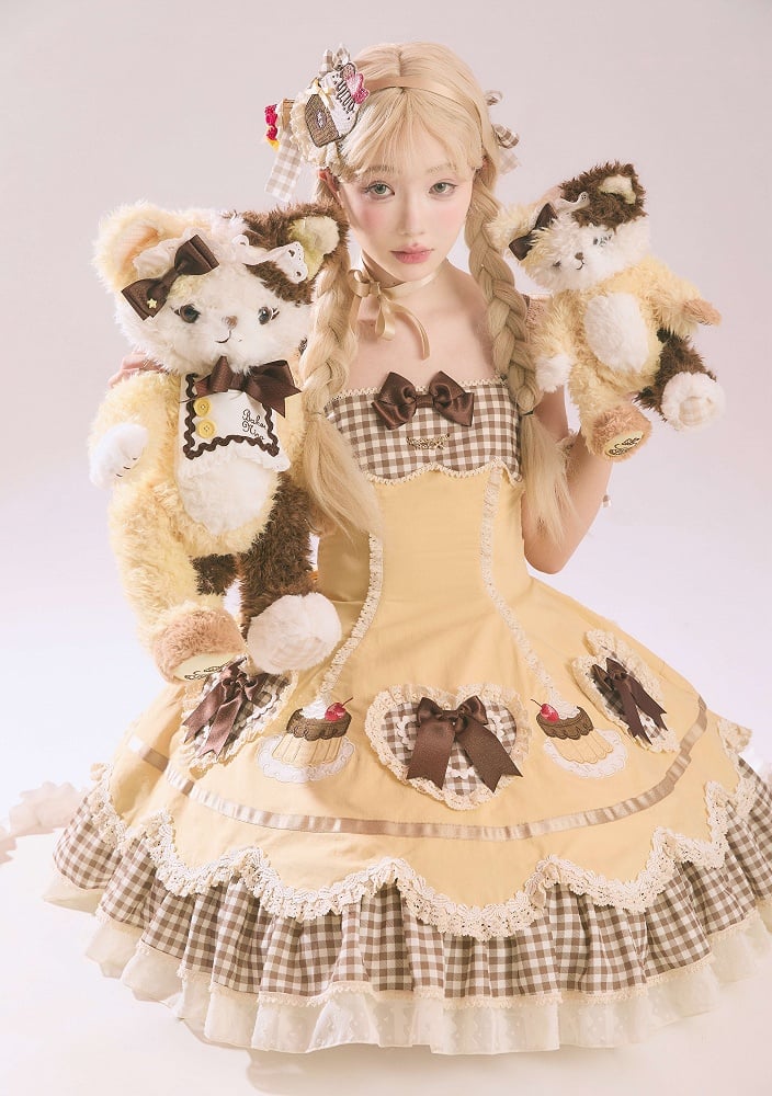 This enchanting dress features a delightful combination of pink and red hues, the hem is beautifully adorned with intricate cake embroidery and heart-shaped appliques that adds a touch of whimsy to your look. The neckline and hemline boast a charming plaid pattern, enhancing the overall aesthetic of the dress. Designed for comfort and style, the back is equipped with shirring and a lace-up for a perfect fit, ensuring you feel as good as you look.
