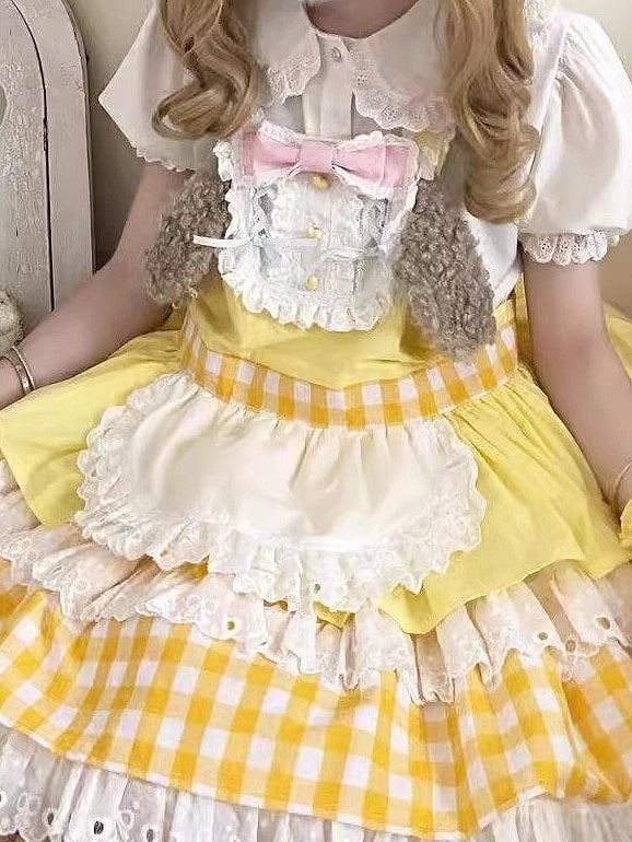 Embrace the playful charm of this sweet Lolita dress, featuring a cheerful yellow gingham pattern that captures the essence of sunny days. The dress is adorned with whimsical puppy ear accents on the chest, adding a touch of adorable fantasy to your look. The apron detail enhances the dress's cuteness, offering a nod to classic Lolita aesthetics while maintaining a fresh and youthful vibe.
