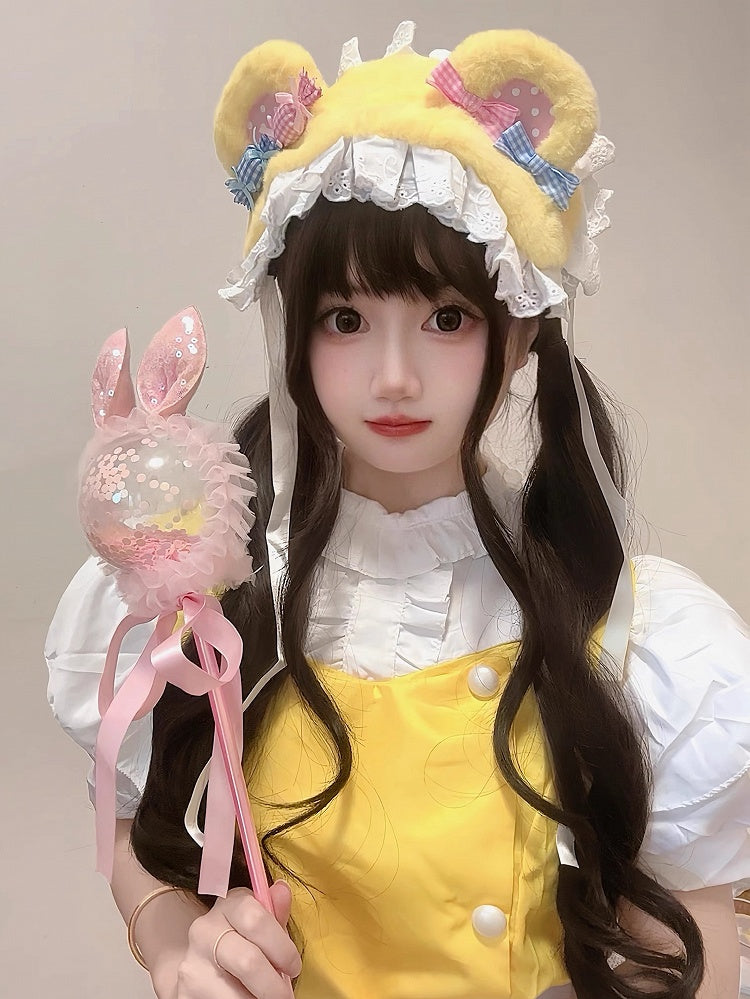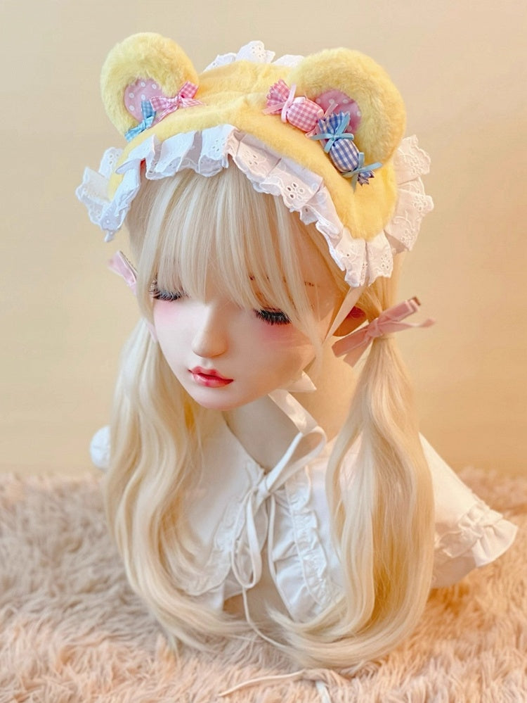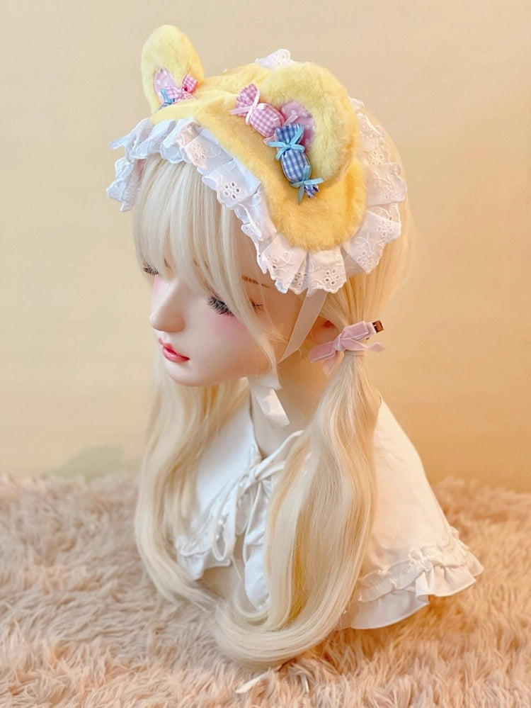 Crafted from soft, plush yellow material, it features cute bear-ear shapes that add a touch of whimsy, adorned with delicate white lace trim along the base, the highlight of this hairband is the decorative candy-shaped embellishments, each wrapped in gingham fabric with tiny bow, available in pink and blue.