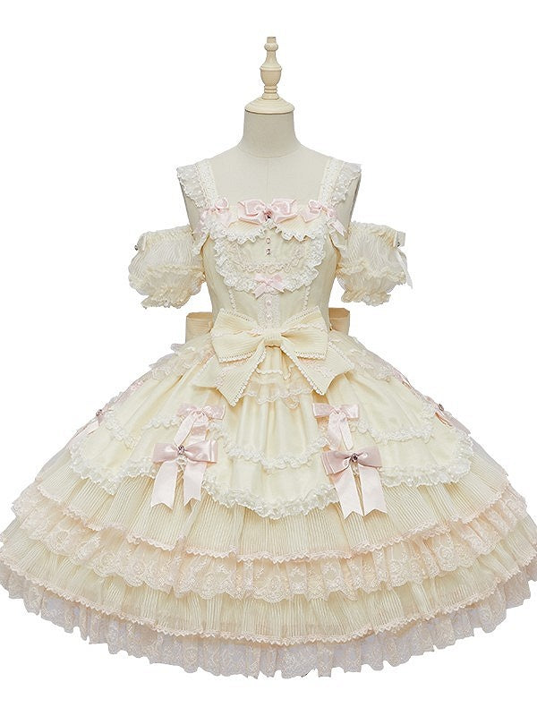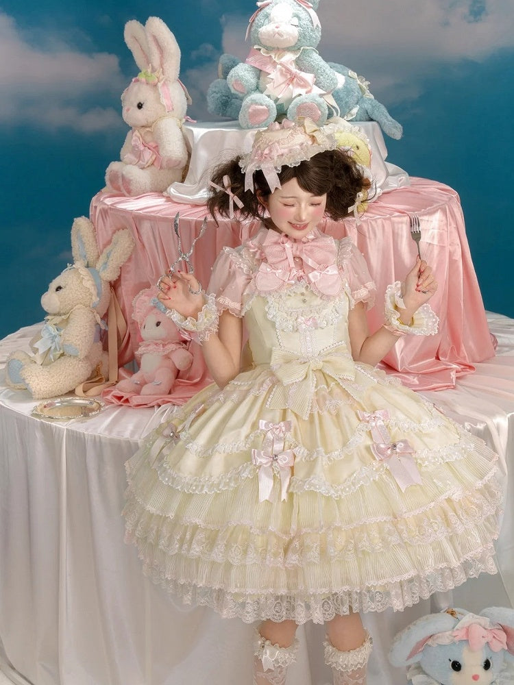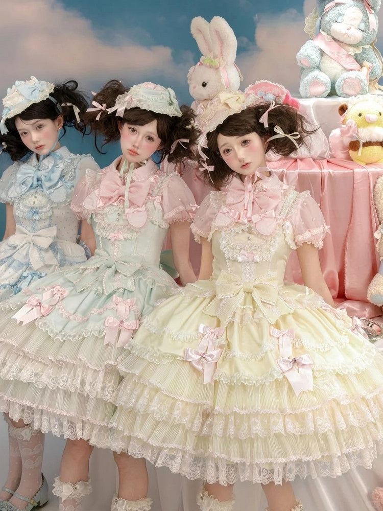 This captivating jumper skirt is a delightful blend of elegance and whimsy, designed to make you feel like royalty. The dress features charming bow accents that adorn the skirt, the back is thoughtfully designed with elastic for a comfortable fit, while a discreet side zipper ensures ease of wear. For added versatility, the dress comes with detachable puff sleeves, allowing you to customize your look effortlessly.
