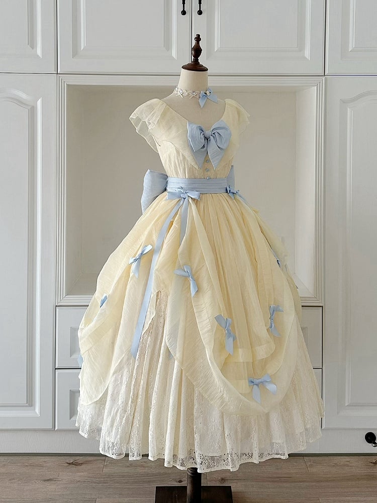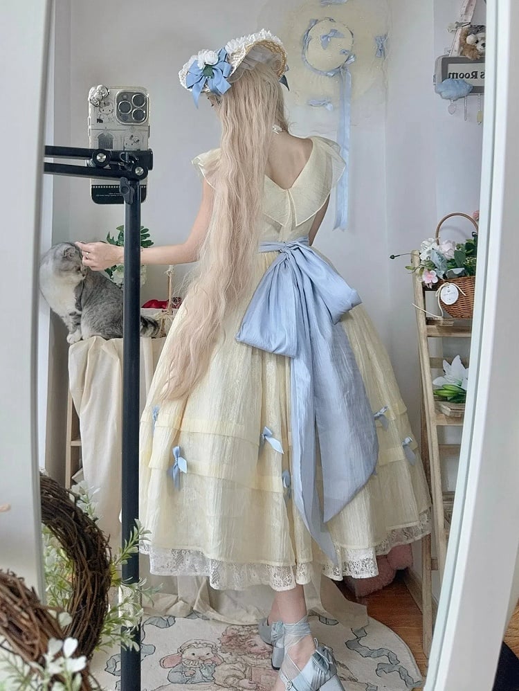 Crafted from a soft, luminous fabric, this dress features a flattering V-neckline that gracefully highlights the neckline. The dress is adorned with delicate, removable blue bowknots, offering versatility to customize your look effortlessly. The dress's silhouette captures the essence of a classic Lolita aesthetic, making it a must-have for those who adore timeless, fairy-tale fashion.