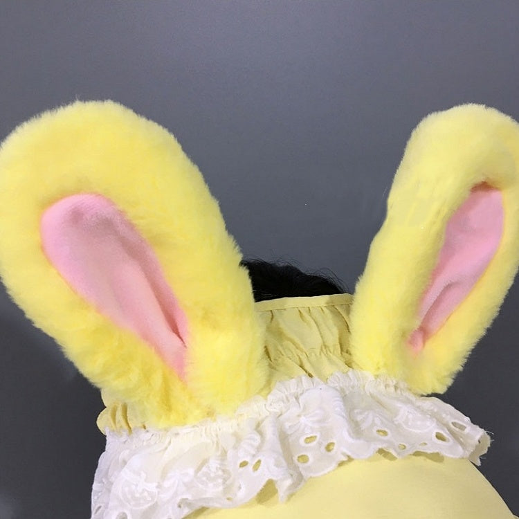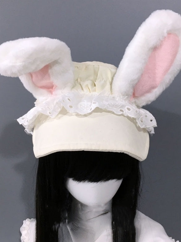 This hat comes in two colors, one is white and the other is yellow. This hat is very cute and has a pair of fluffy rabbit ears on it.